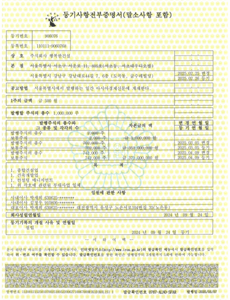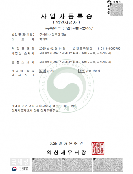 (주)행복한건설 | 대표이사 : 박채희 | 주소 : 서울특별시 강남구 강남대로44길 7,6층